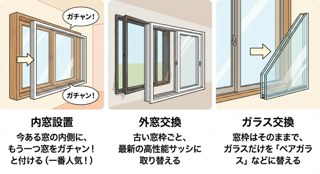 3. ガラス交換: 窓枠はそのままで、ガラスだけを「ペアガラス」などに替える